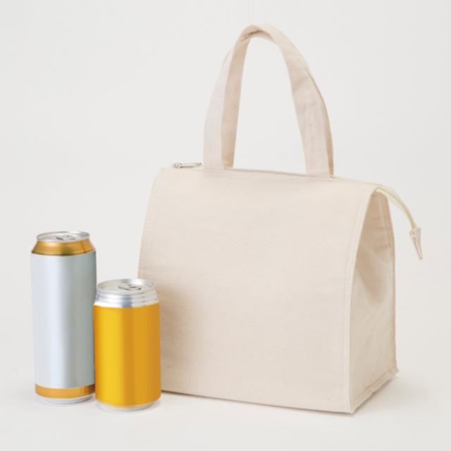 TR-0868 | MARKLESS STYLE保冷温付きのコンパクトな保冷バッグが登場しました。ランチバッグやお弁当に最適!缶飲料なら6本入るので、アウトドアにも便利です。内側のアルミが保冷保温効果を発揮、食材が痛むのを防ぎます。表面はコットン生地を使用し、厚みがありしっかりしています。スリムだけどマチ付きだから、お弁当箱や水筒を入れた時も傾きにくくなっています。ファスナー付きなので中身も見えなくて安心です。ナチュラルとブラックの2色からお選びいただけますので、男性の方にもオススメ!お店のロゴや名入れでノベルティとしてオリジナルバッグはいかがですか。